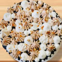 Torta de chocolate con café, elaborada con un bizcochuelo húmedo de chocolate, relleno de crema mocha(chantilly con café y fudge), decorado con crema chantilly y almendras acarameladas. 14 cm de diametro.